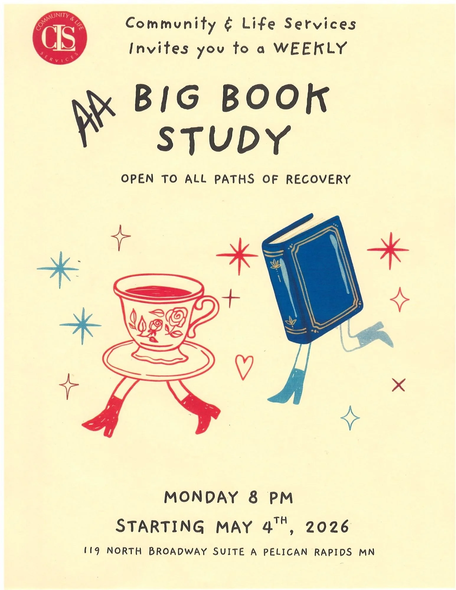 AA BIG BOOK STUDY Monday, May 4, 2026 8:00 PM Monday, December 21, 2026 9:00 PM Community & Life Services 119 North Broadway Pelican Rapids, MN, 56572 United States (map) Google Calendar ICS